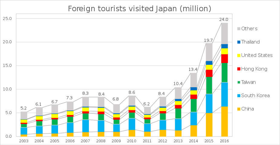 The increasing foreign tourists in Japan 2003-2016 bar graph results shown above: