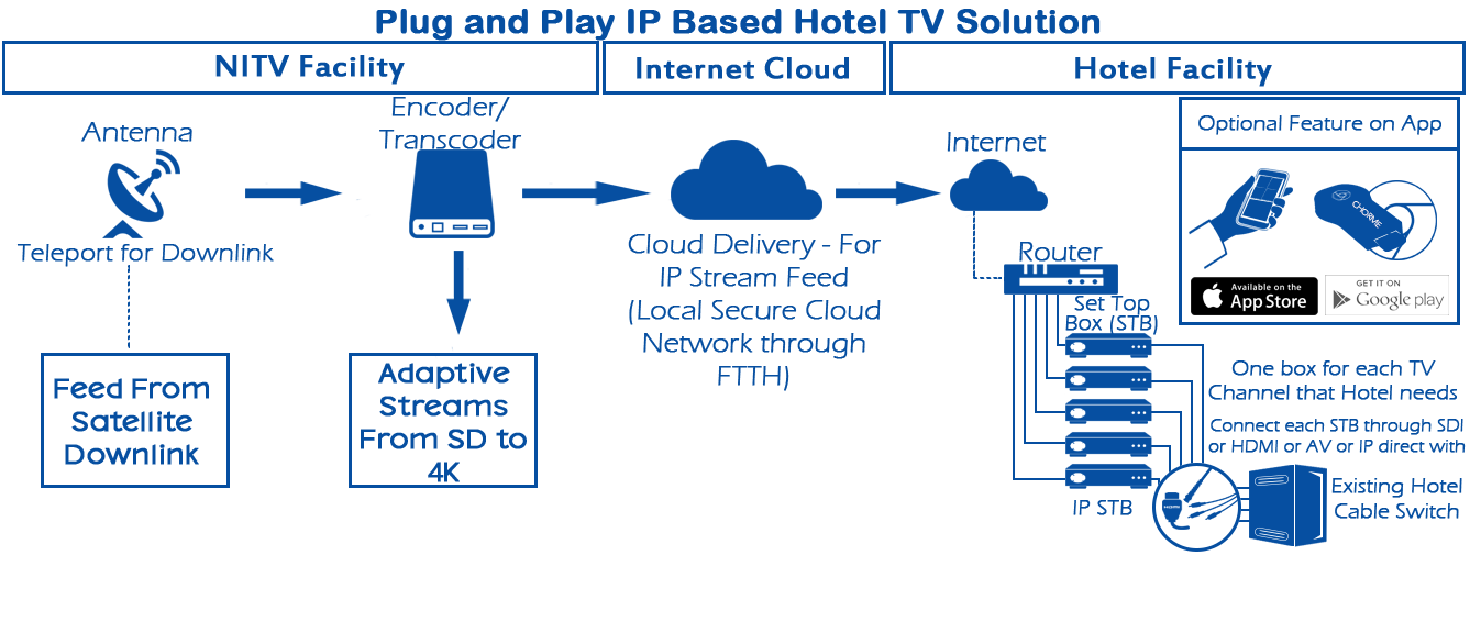 Hotel TV working mechanism is simple to understand as displayed in the picture shown. The streamings are down linked from the source feed. These down linked sources are encoded/decoded using our transcoding device into multiple video formats which would range from SD to 4K. Thus, these converted videos are then pushed in to our Cloud Network from where sources are easily distributed to the desired destination. Hence, viewers can easily watch their live television channels from anywhere with the internet connected devices.